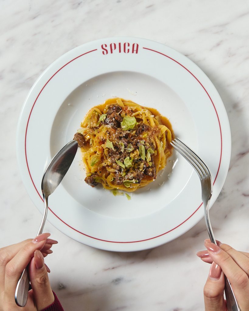 ソースに溶け込ませた蕗のとうと、香ばしい蕗のとうのフリットを重ね、春らしいほろ苦さを添えたSPICAならではの一皿です🍝