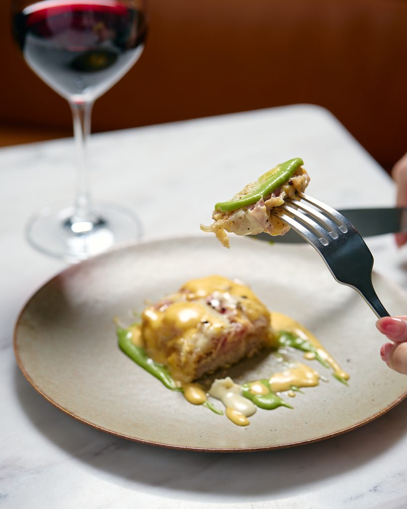 コク深いチーズソースに、グリーンピースのピューレがやさしい甘みと季節の軽やかさを添える一皿です。