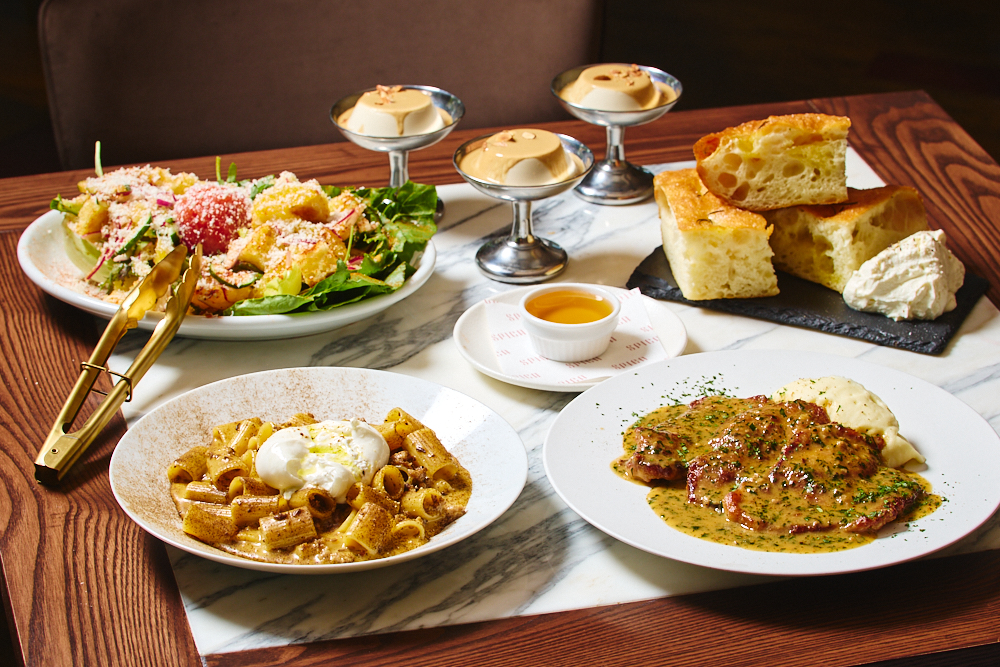 今回も、シェアで楽しめるボリュームたっぷりのメニューの数々をご用意いたしました。サラダは「夏野菜のパンツァネッラ」。きゅうり・トマトなど旬の夏野菜をふんだんに使った「パンツァネッラ」。彩り豊かな野菜とカリッと焼いたパンが食感と味わいのアクセントに。パスタは、濃厚で香り高い「リガトーニ キノコのカルボナーラ」。ブッラータチーズを加えれば、さらに贅沢な味わいに。メインは、「豚のスカロッピーネ」を、レモンとハーブ香る爽やかなソースで夏らしく仕上げました。